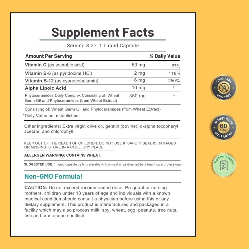 † Daily Value not establishedCeramides are lipids (oil-based compounds). Our softgel formula disperses them in extra virgin olive oil and wheat germ oil, optimizing absorption through your digestive system—far superior to tablets or powders.